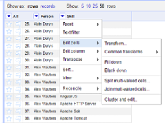 This list has to be cleared further to streamline the notations and to remove any clutter. For this I jumped to Open Refine. In R I exported the list of extracted skills for each consultant to a CSV-file in which each row consists of two columns: the name of the person and a single skill. Next, I performed the following actions on the second column: