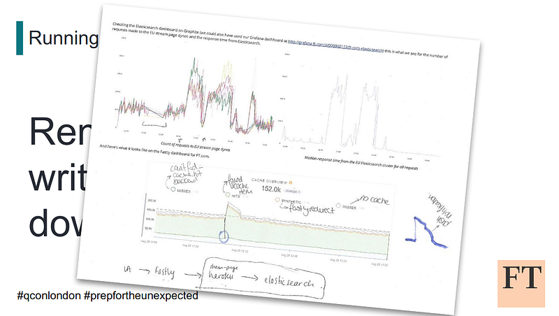 In ‘Preparing for the Unexpected’, Samuel Parkinson from ft.com shared their story of when the domain ft.com disappeared, and how they prepare their build teams to support these weird incidents. They run workshops where they replay old incidents with printed hand-outs of graphs and comments made at the time.