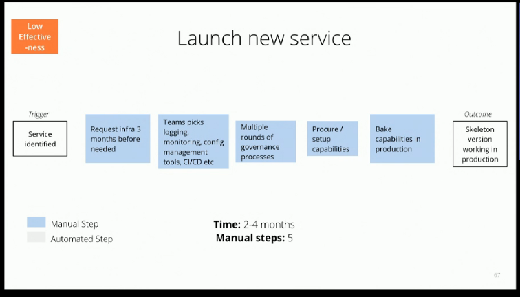 To get a better idea of what the key improvements are, Tim Cochran of Thoughtworks shared some developer effectiveness metrics. Which different tasks are developers occupied with on a daily basis, and how long do they take? It could be onboarding a new team member, to launching a new service, validating a component in a dev environment or that it integrates with other services and so on.